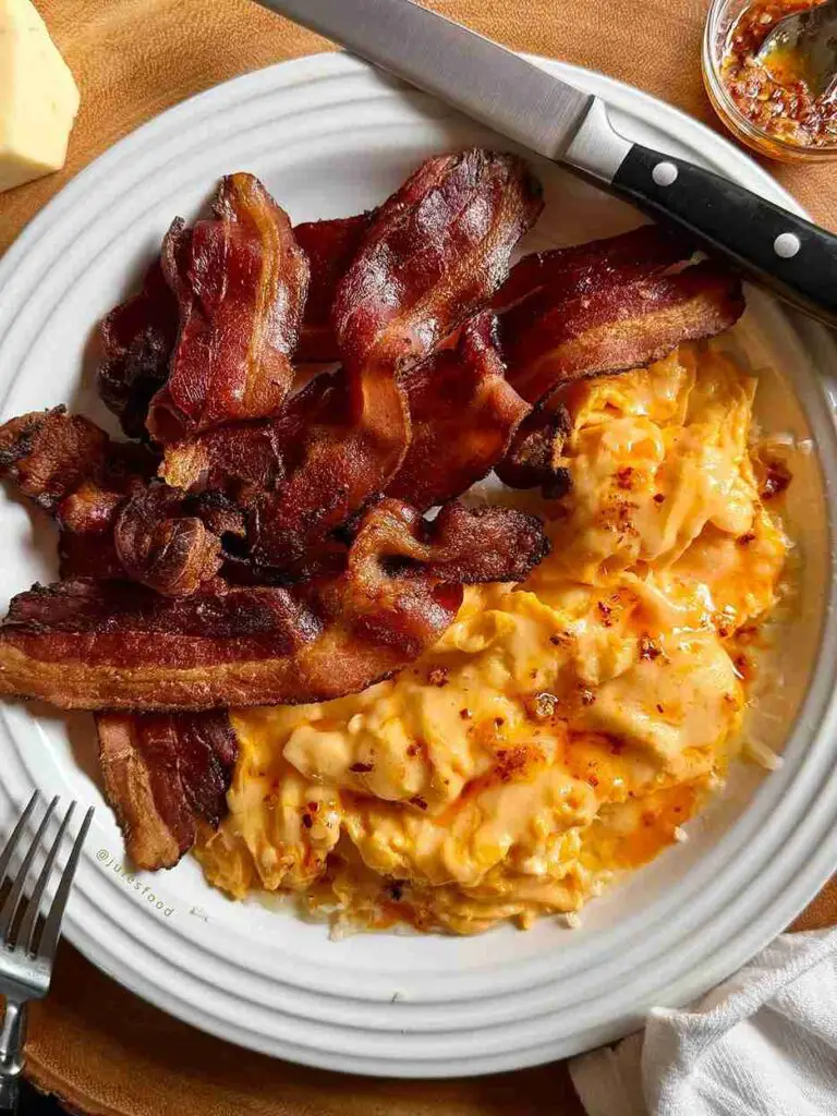 - Breakfast: 4 large eggs fried in butter with 3 slices of thick-cut bacon.
