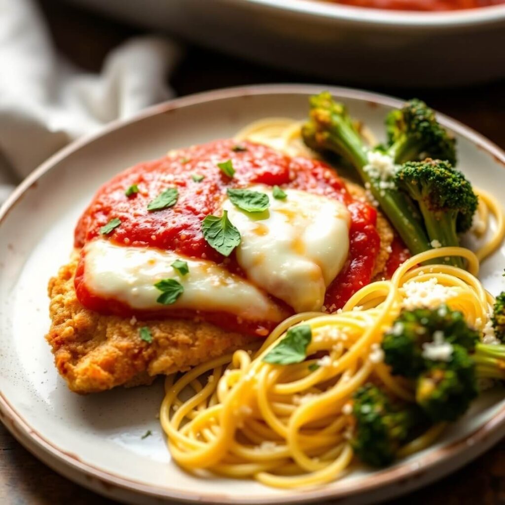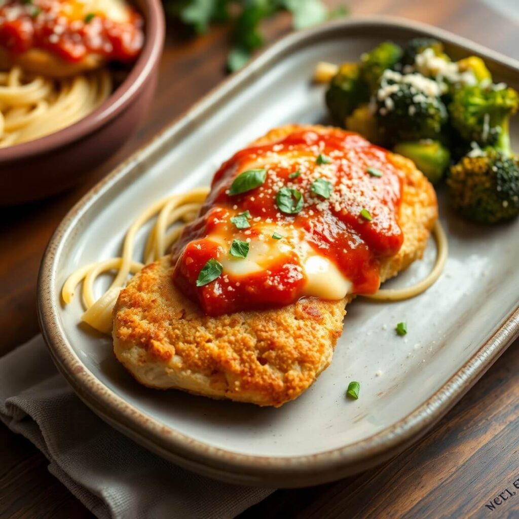 One of the easiest ways to elevate your Air Fryer Chicken Parmesan is by serving it with a little flair. I love plating each cutlet individually with a swirl of warm marinara on the bottom, then laying the chicken right on top. It makes everything look intentional and keeps the bottom of the chicken crispy.