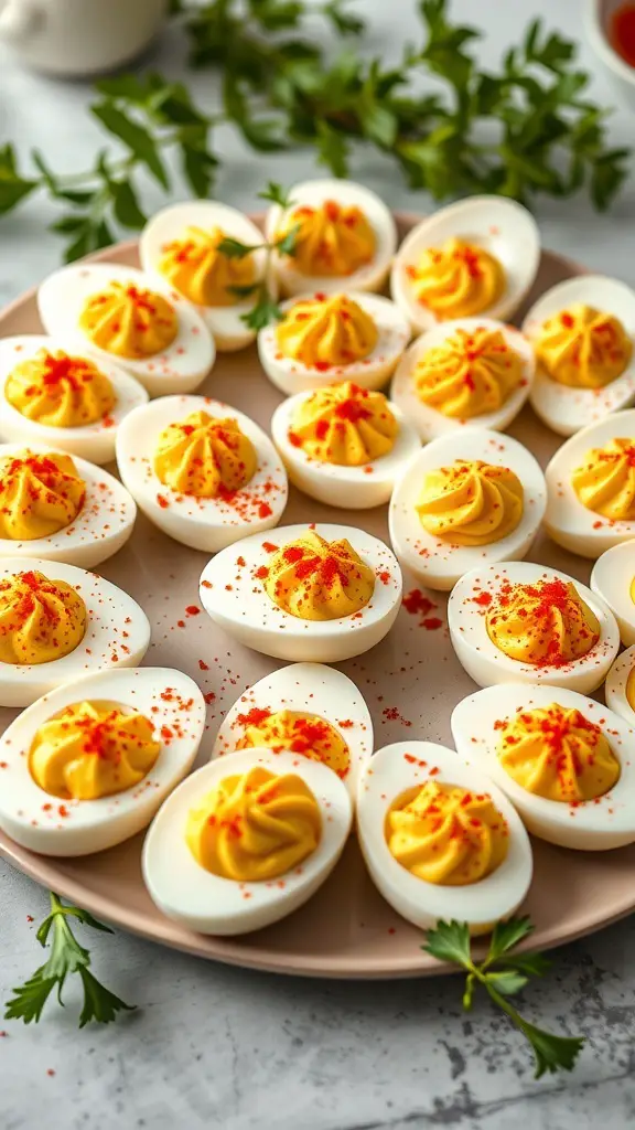Deviled eggs are a classic side dish that never fails to impress. They are simple to make and always a hit at gatherings. The image showcases a beautiful platter filled with deviled eggs, each topped with a sprinkle of paprika for that extra pop of color and flavor.