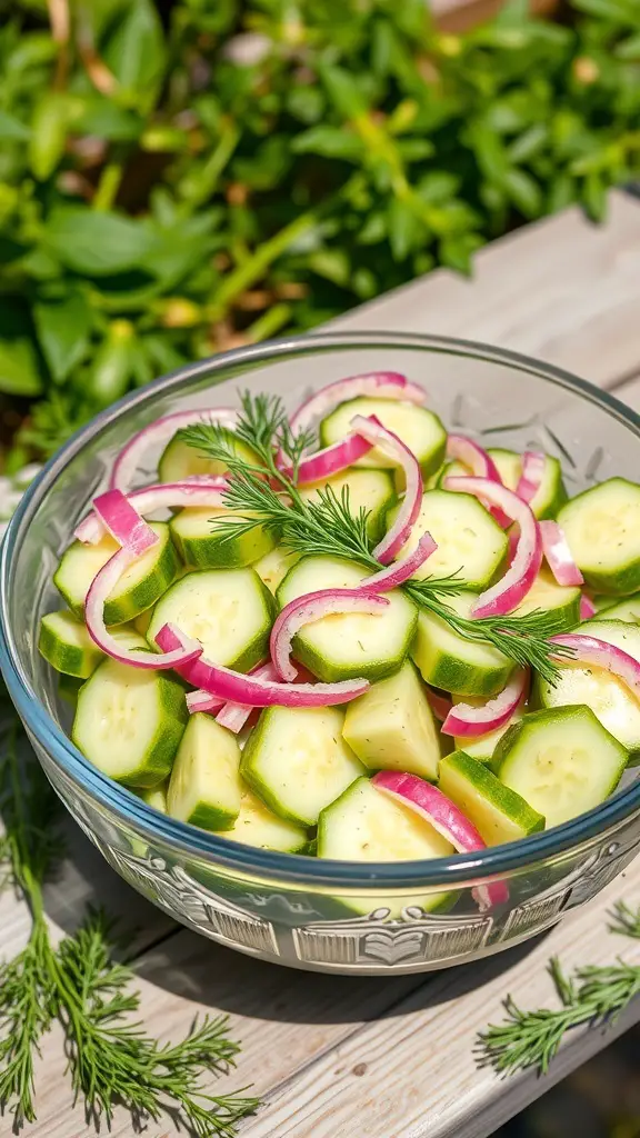 The salad features crisp cucumber slices mixed with thinly sliced red onions, all tossed in a zesty dressing. Fresh dill adds an aromatic touch, enhancing the overall flavor. It’s a simple yet delightful addition to your summer meals.