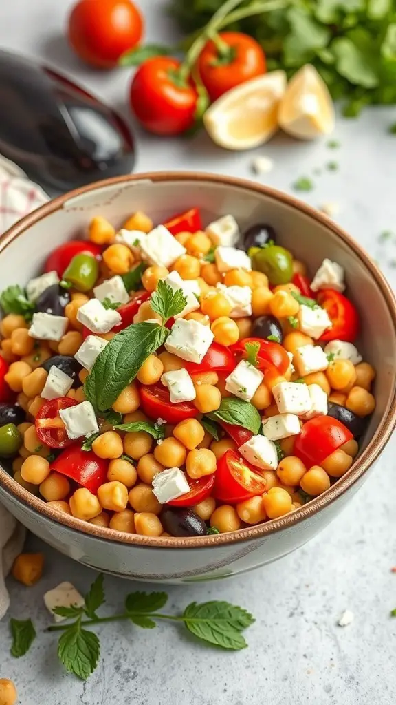 To make this salad, gather ingredients like canned chickpeas, diced tomatoes, green and black olives, crumbled feta, and fresh herbs like parsley and mint. Toss everything together in a bowl for a quick and easy dish.