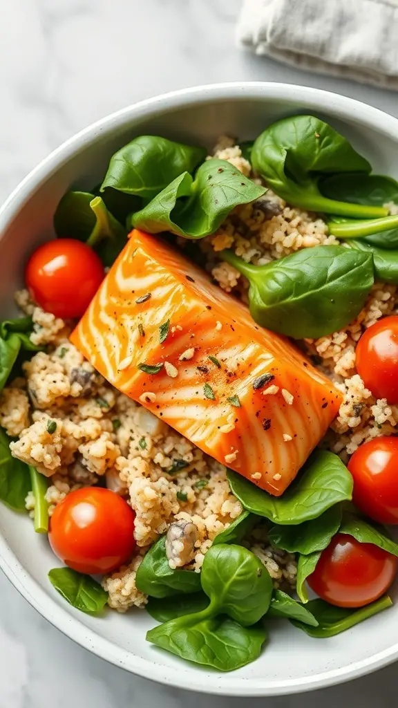 To make this bowl, start with cooked quinoa as your base. Add a generous handful of fresh spinach for that crisp, green goodness. Top it off with a perfectly cooked piece of salmon, seasoned just right. Cherry tomatoes add a burst of sweetness, balancing the savory elements beautifully.