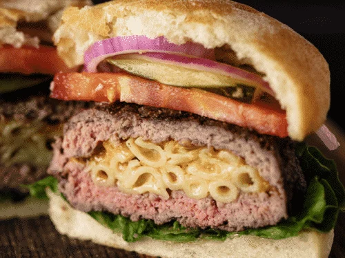 Juicy beef forms a thick patty with a rich, cheesy center that melts as you bite into it. Crispy edges on the outside give a strong texture, while the inside stays soft and full of flavor. Layers of meat and cheese create a heavy, satisfying bite every time.