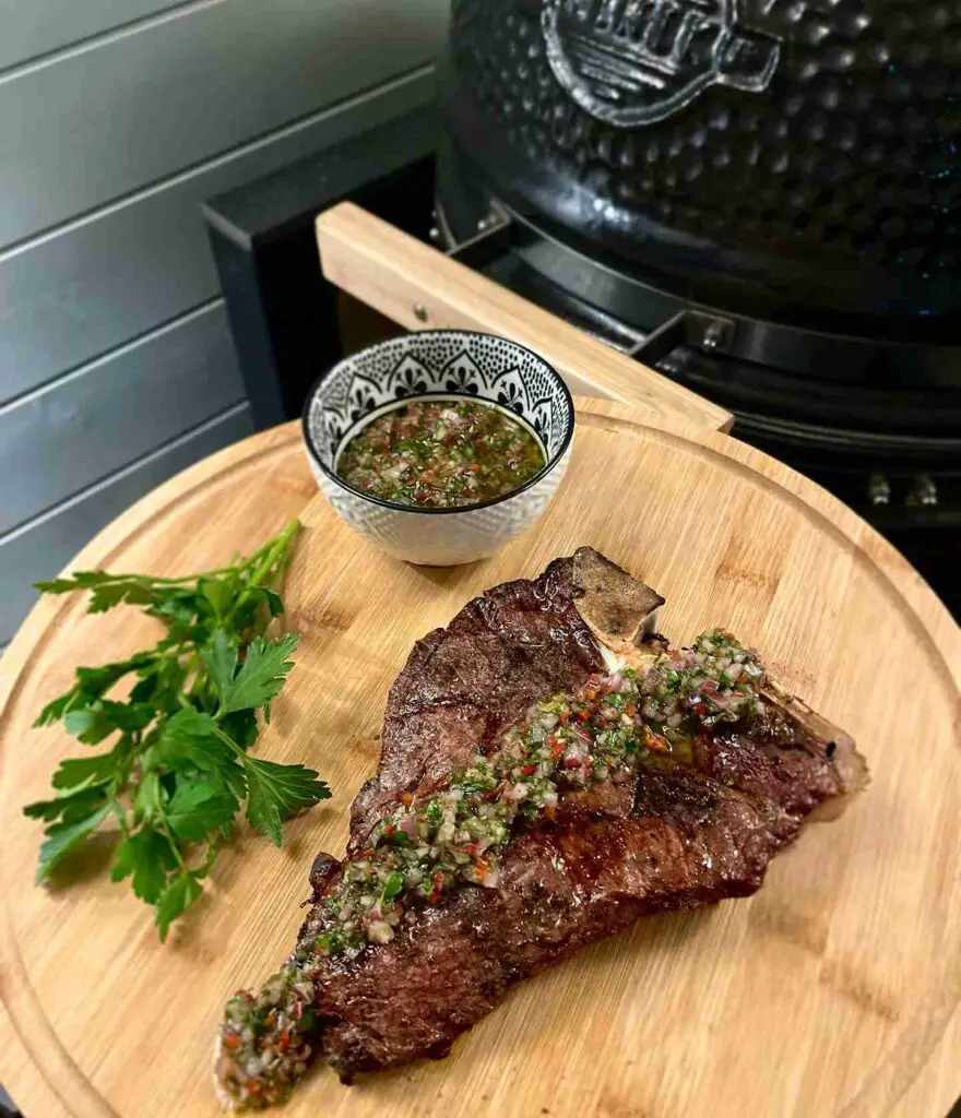 Charred steak rests juicy and tender, with a rich crust formed from high heat. Fresh herb sauce spread across the top adds a sharp, bright contrast to the deep meat flavor. Natural juices mix with the sauce, creating a smooth and balanced bite.