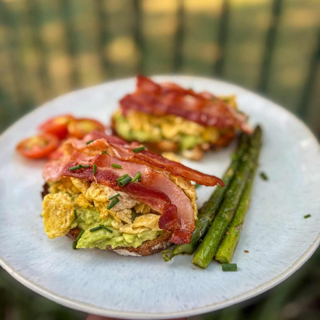 Pick up a fork and mix the eggs with small pieces of bacon for a balanced bite. Meals like this work well in the morning when you want something filling but quick to cook. Simple combinations like this help you stay consistent without overthinking meals.