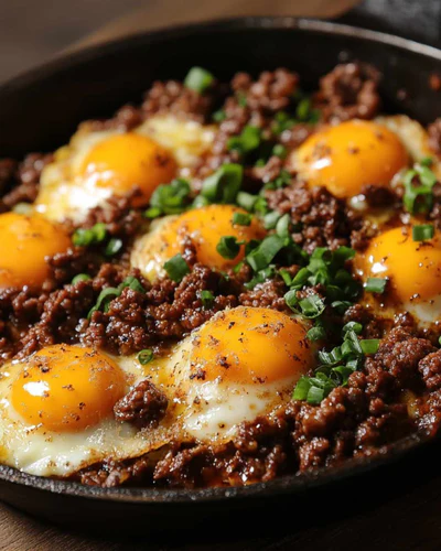 Sizzling ground beef fills the pan with rich flavor while eggs cook gently right on top. Golden yolks sit across the surface, adding a soft texture against the crispy meat. Fresh green herbs scattered over everything give a light contrast to the deep, savory taste.