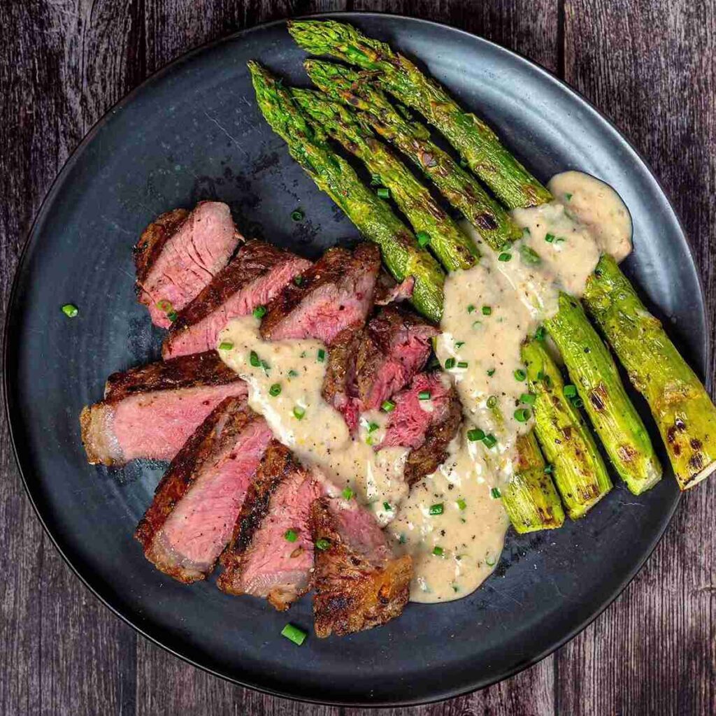 This plate feels balanced without trying too hard. Juicy steak slices bring that deep, rich flavor, while grilled asparagus adds a fresh and slightly smoky bite.
