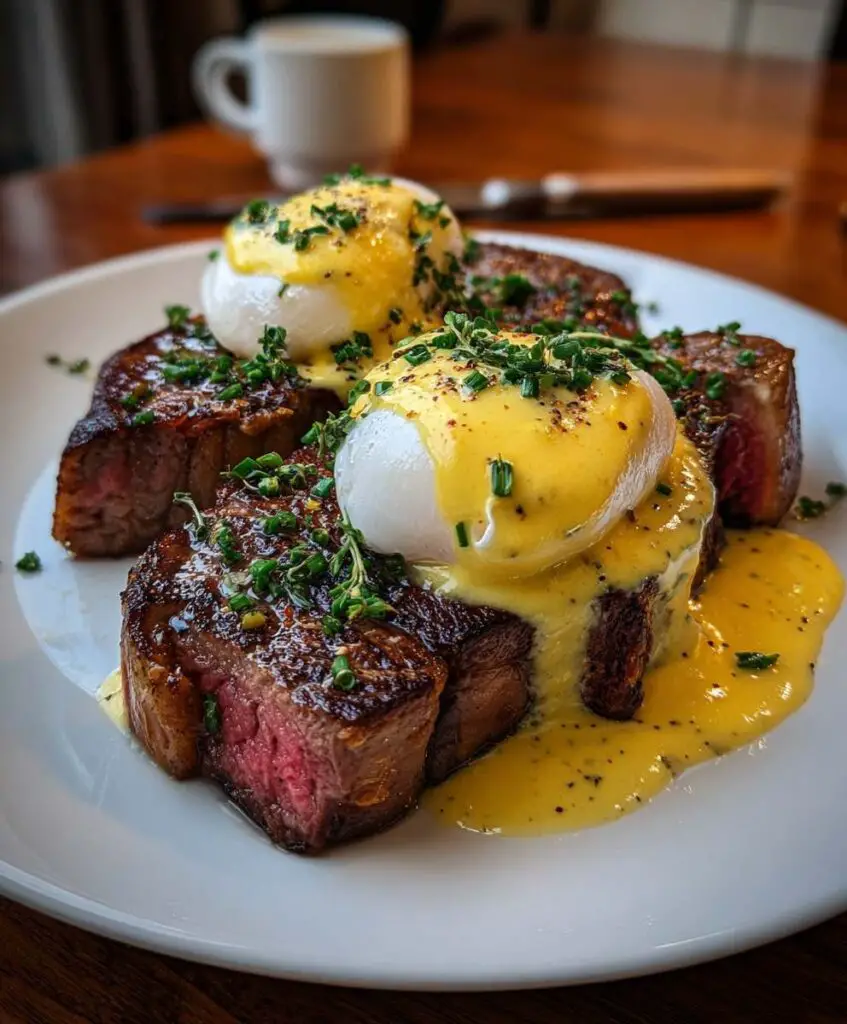 Rich, juicy steak sits at the center, topped with soft eggs that break open and spill golden sauce. Warm butter coats every bite, adding depth and keeping the meat tender. Fresh herbs bring a slight lift without taking attention away from the main flavors.