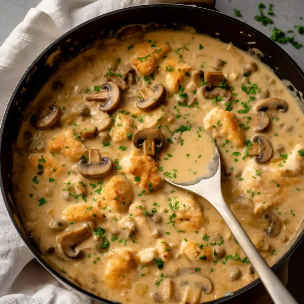 This is comfort food that feels rich from the first bite. Tender pieces of chicken sit in a thick, creamy sauce loaded with mushrooms. Everything cooks together, so the flavors blend naturally.