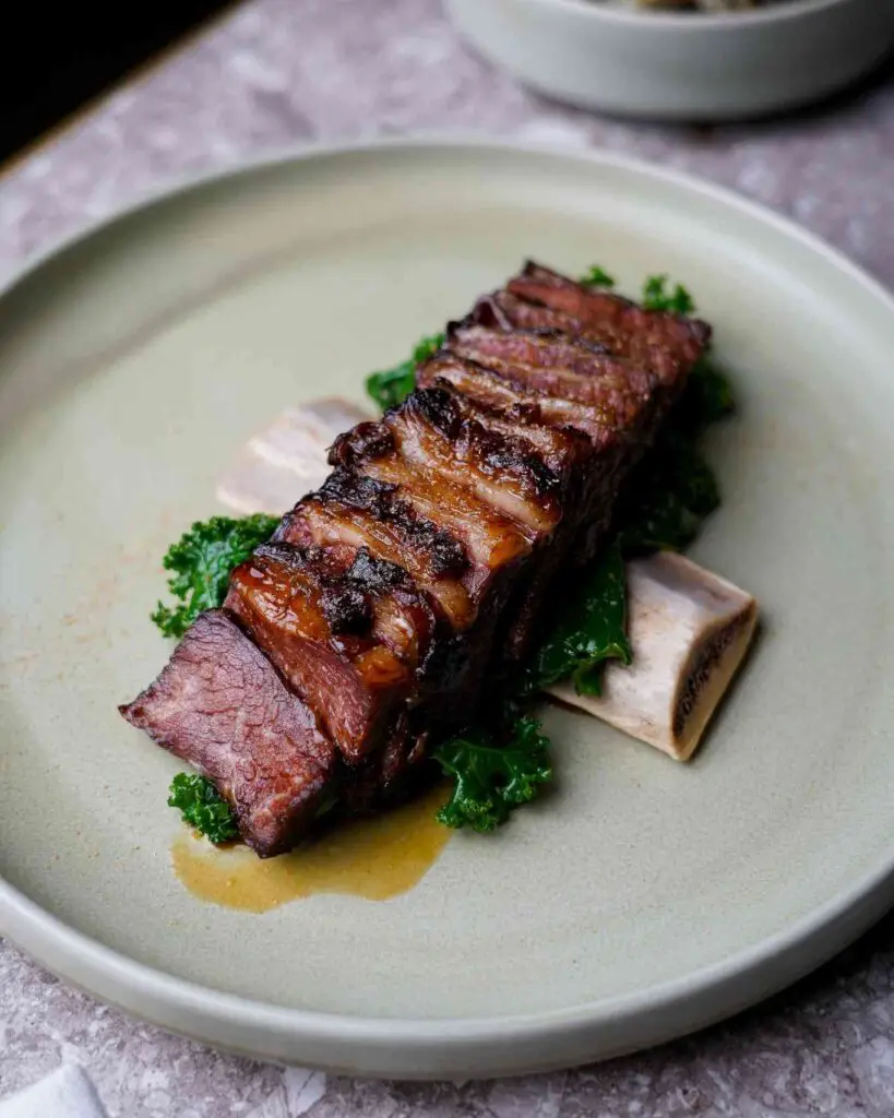 Thick beef ribs sit tender and juicy, with a deep browned crust on the outside. Slow cooking brings out rich flavor, making the meat soft enough to pull apart with ease. Natural juices collect underneath, adding extra depth to every bite.