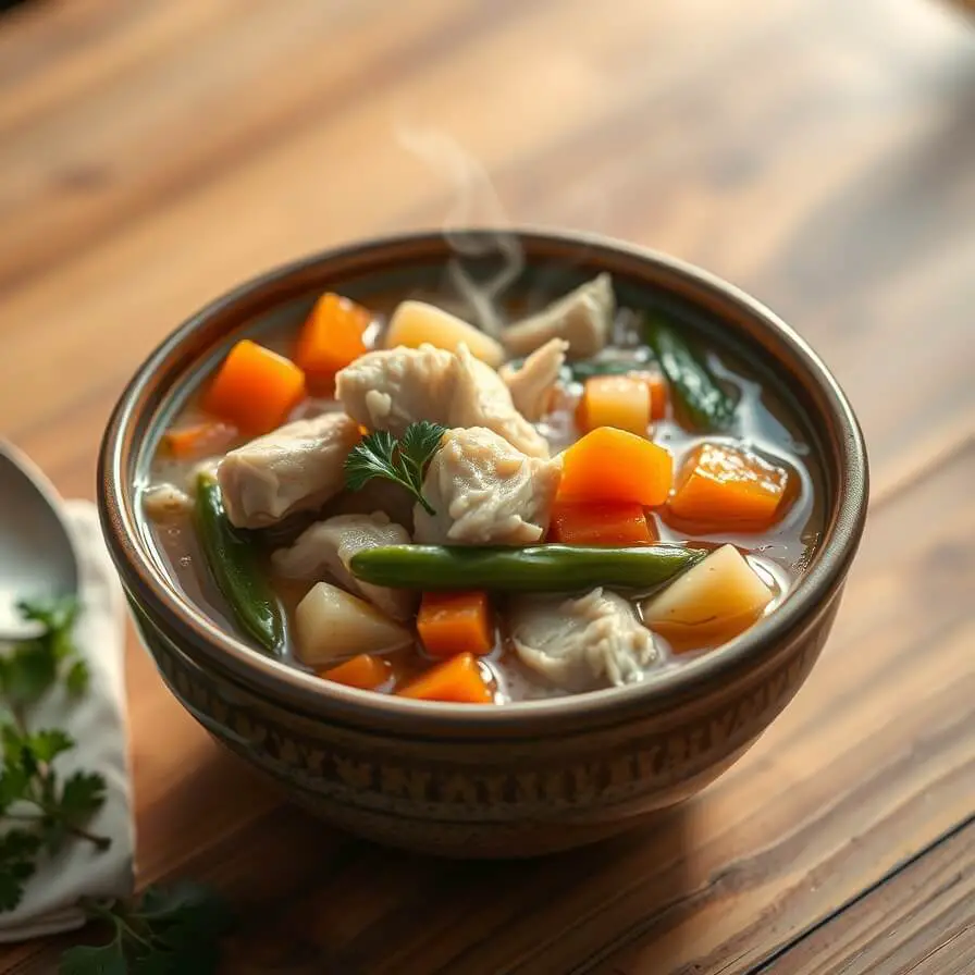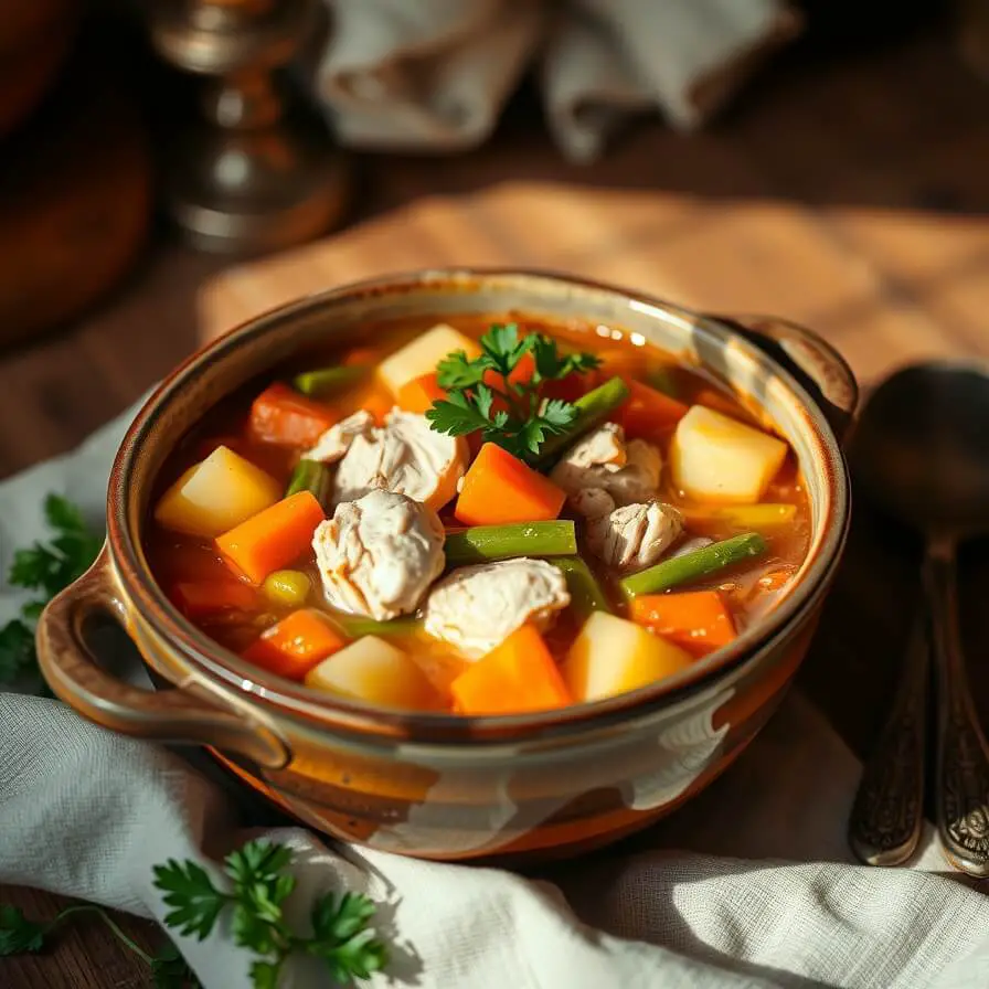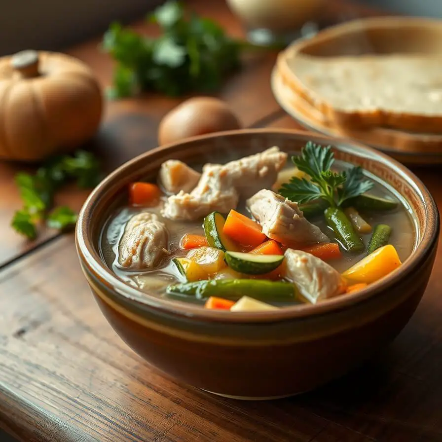 Serving chicken and vegetable soup isn’t just about ladling it into a bowl—it’s about creating a little moment of comfort at the table. I like to serve it in deep, wide bowls so that the broth, chicken, and vegetables are beautifully visible. A sprinkle of fresh parsley or a few thyme leaves on top instantly elevates the presentation and makes the soup feel fresh and inviting.