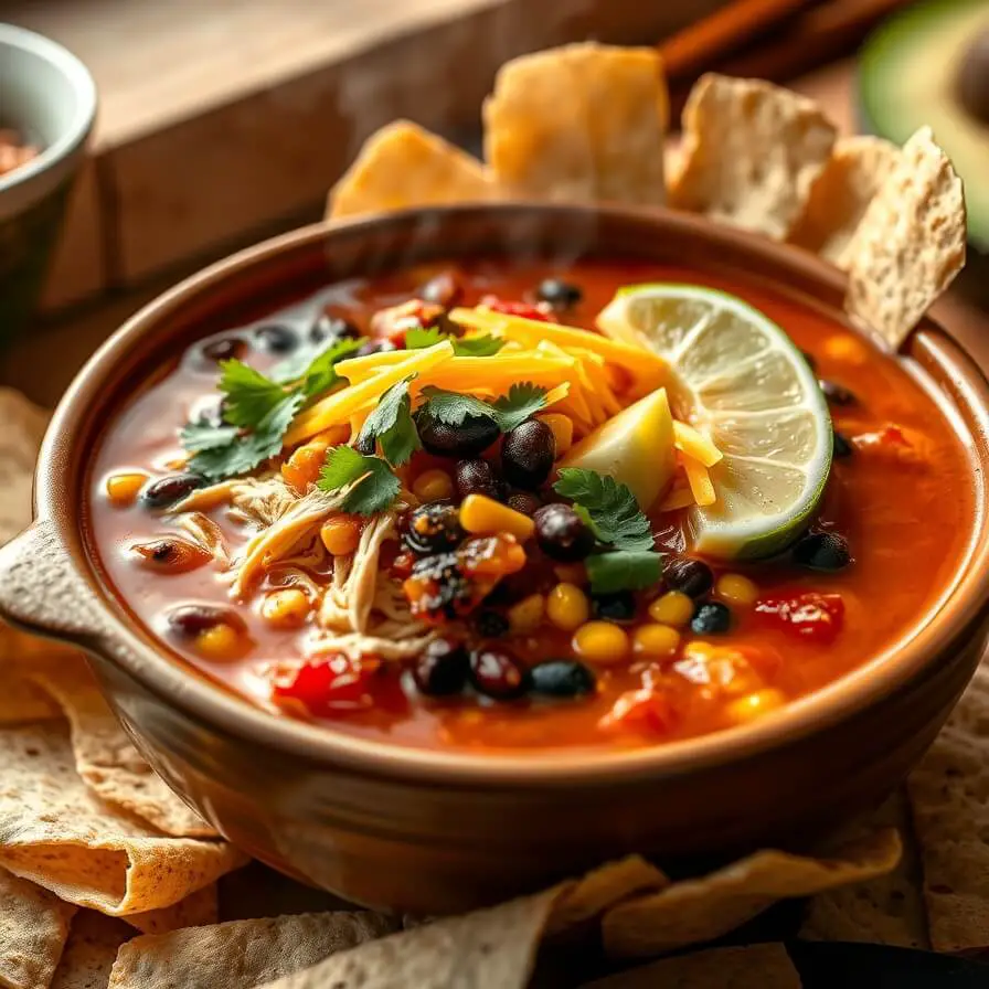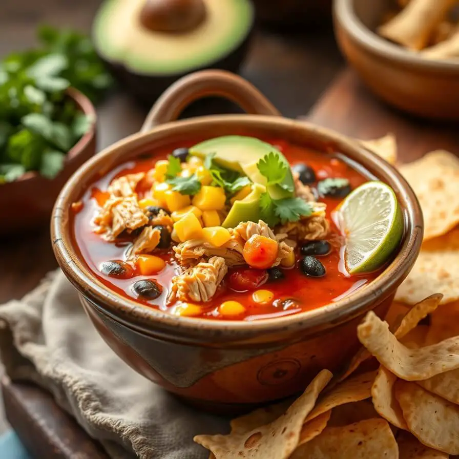 - Serve with toppings like tortilla strips, cilantro, sour cream, avocado, and lime wedges.