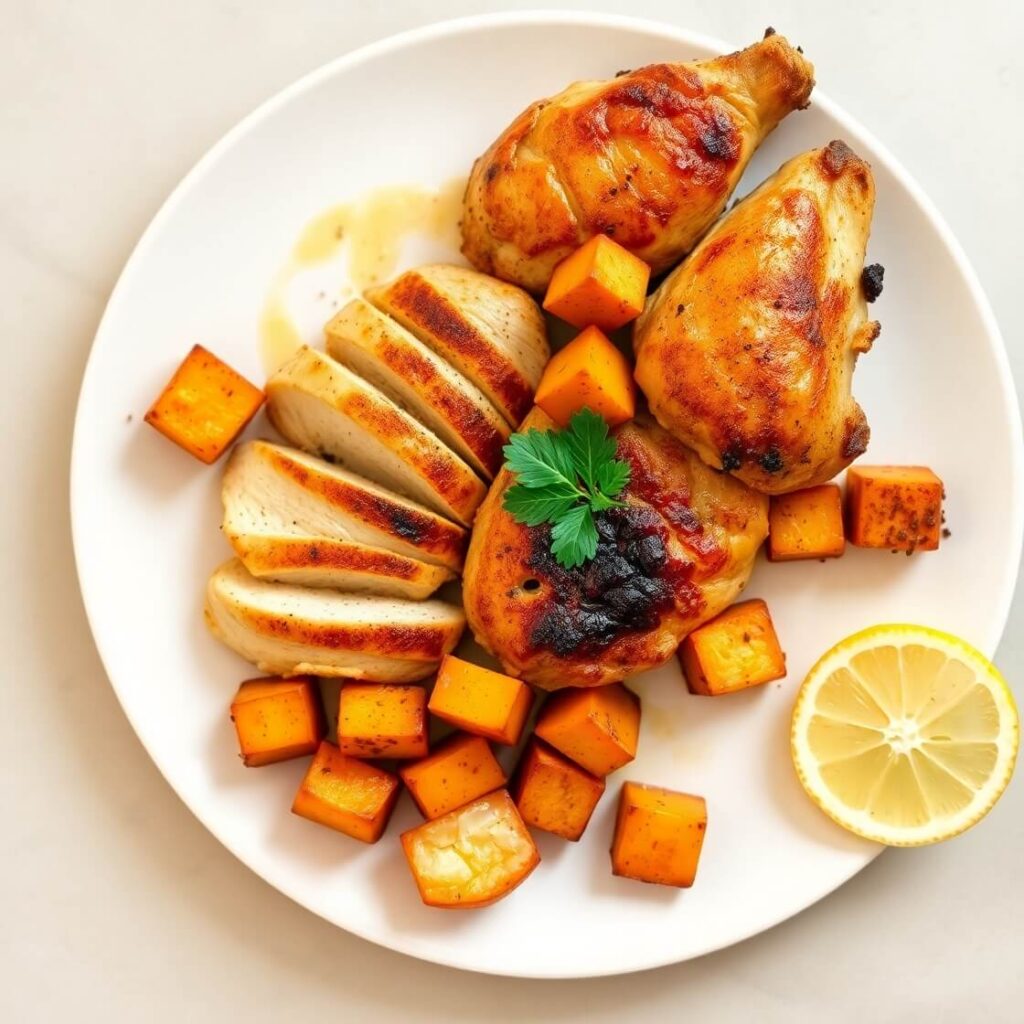 While the sweet potatoes are roasting, heat a skillet over medium-high heat. Add a small drizzle of olive oil and sear the chicken breasts or thighs for 3–4 minutes per side until golden brown. This step locks in the juices and adds extra flavor.