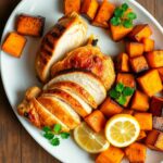 I like to serve the roasted chicken sliced diagonally across the grain—it not only looks elegant but also shows off the golden sear on the outside. Arrange the sweet potatoes beside the chicken rather than underneath, so their caramelized edges are visible. A sprinkle of fresh parsley or thyme adds a pop of color, while a lemon wedge on the side offers a finishing touch of brightness.