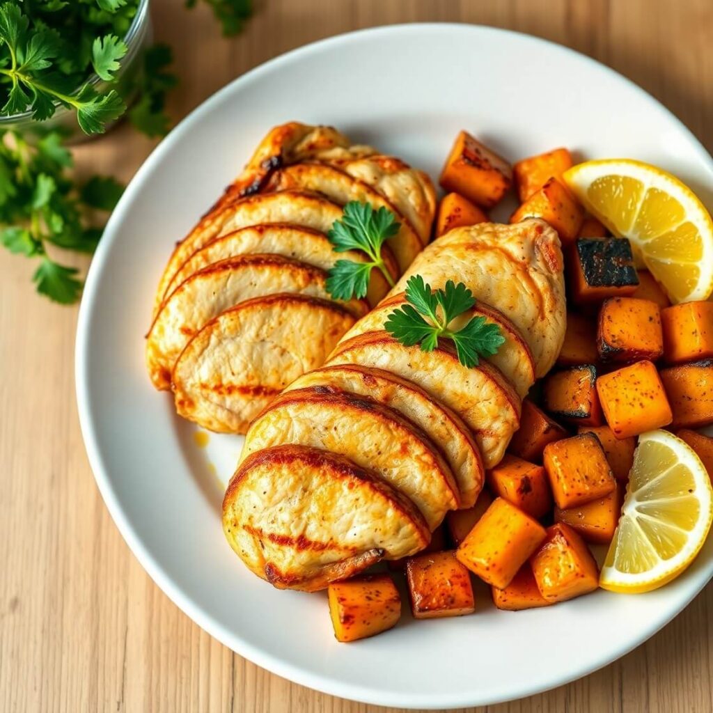 While the sweet potatoes are roasting, heat a skillet over medium-high heat. Add a small drizzle of olive oil and sear the chicken breasts or thighs for 3–4 minutes per side until golden brown. This step locks in the juices and adds extra flavor.
