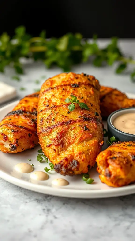 In the image, you can see beautifully baked chicken tenderloins, showcasing a crispy exterior that promises a delightful crunch. The tenderloins are garnished with fresh herbs, adding a pop of color and freshness. A small bowl of dipping sauce sits alongside, perfect for those who enjoy a little extra flavor.