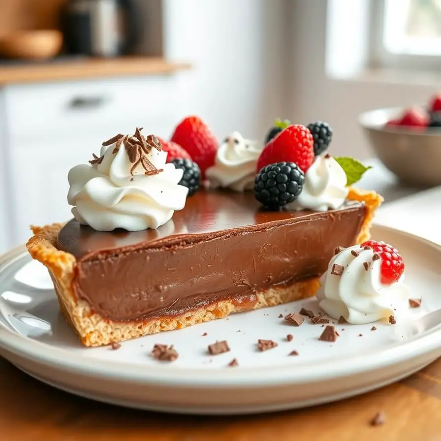 For presentation, you can keep it simple or dress it up. A dollop of lightly sweetened whipped cream on each slice instantly adds elegance. If you want a touch of drama, a few chocolate shavings or cocoa dusting on top creates a café-style look. You can even arrange fresh berries along the edge of the pie for a pop of color that contrasts with the deep chocolate filling.
