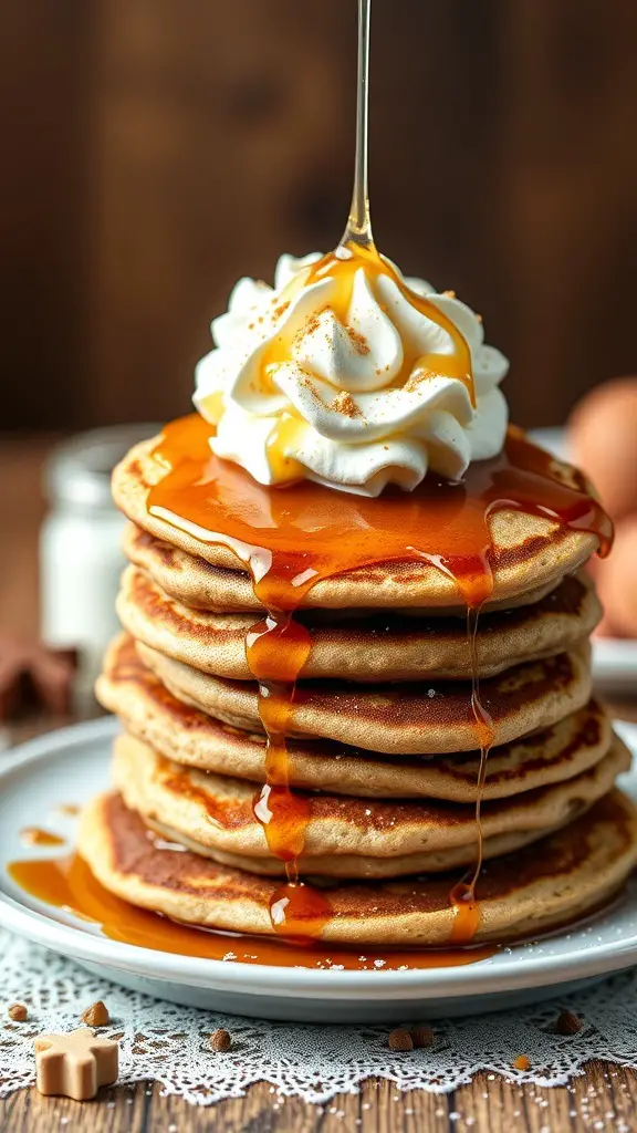 Gingerbread pancakes are a delightful twist on a classic breakfast favorite. These fluffy stacks are infused with warm spices that evoke the cozy feelings of the holiday season. The image shows a tall pile of golden pancakes, perfectly cooked and drizzled with rich maple syrup. A dollop of whipped cream on top adds a touch of sweetness and creaminess.