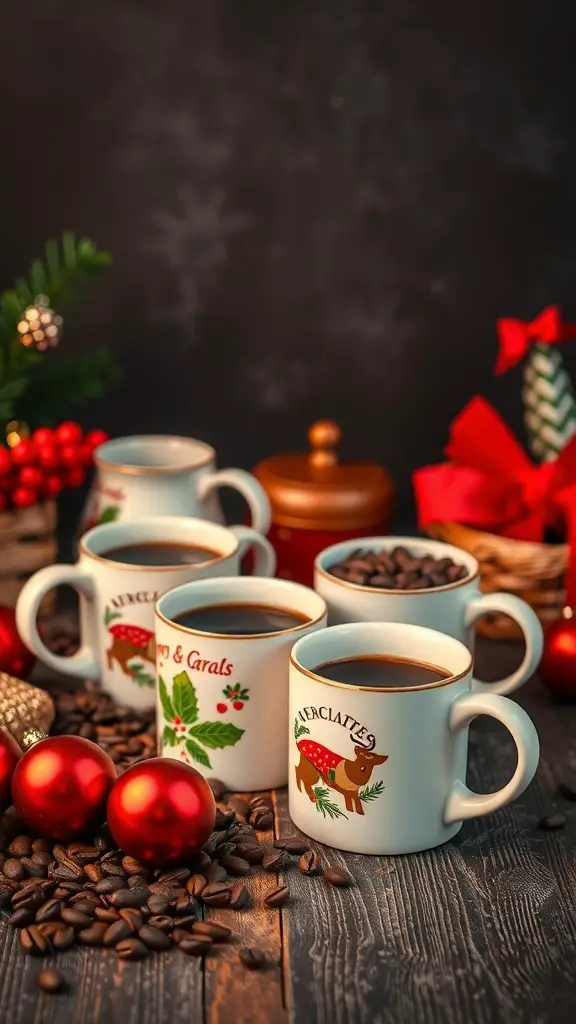 Start with some cute mugs that reflect the holiday spirit. The mugs in the image feature fun designs, making them perfect for serving coffee to friends and family. You can also add a few festive ornaments, like the shiny red balls, to enhance the decor.