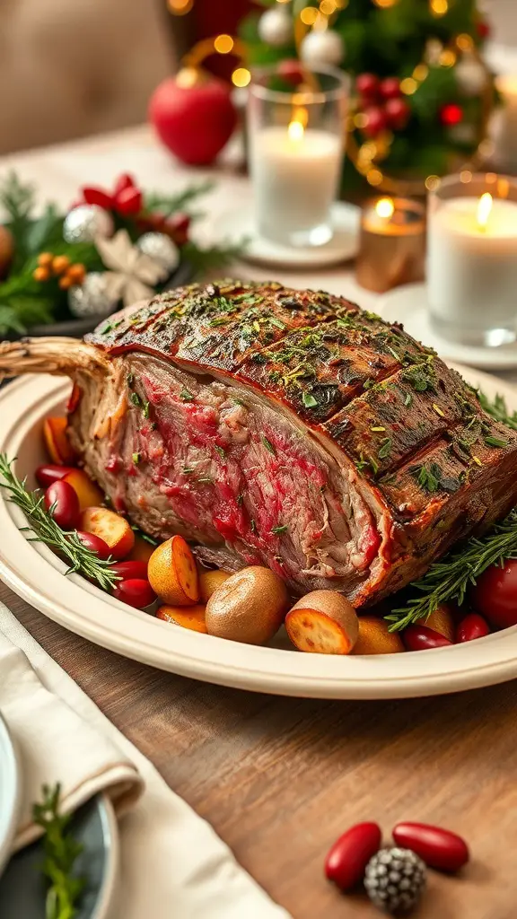 Herb-crusted prime rib is a showstopper for any Christmas Eve dinner. The image captures a beautifully roasted prime rib, perfectly cooked and glistening with herbs. The rich colors of the meat are complemented by the vibrant garnishes of rosemary and cherry tomatoes, making it not just a meal but a centerpiece.