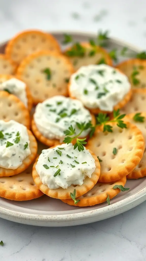 This herbed cream cheese spread is a delightful addition to any gathering. The image shows a plate filled with club crackers topped with a creamy, herb-infused cheese mixture. The fresh green herbs sprinkled on top add a pop of color and flavor.
