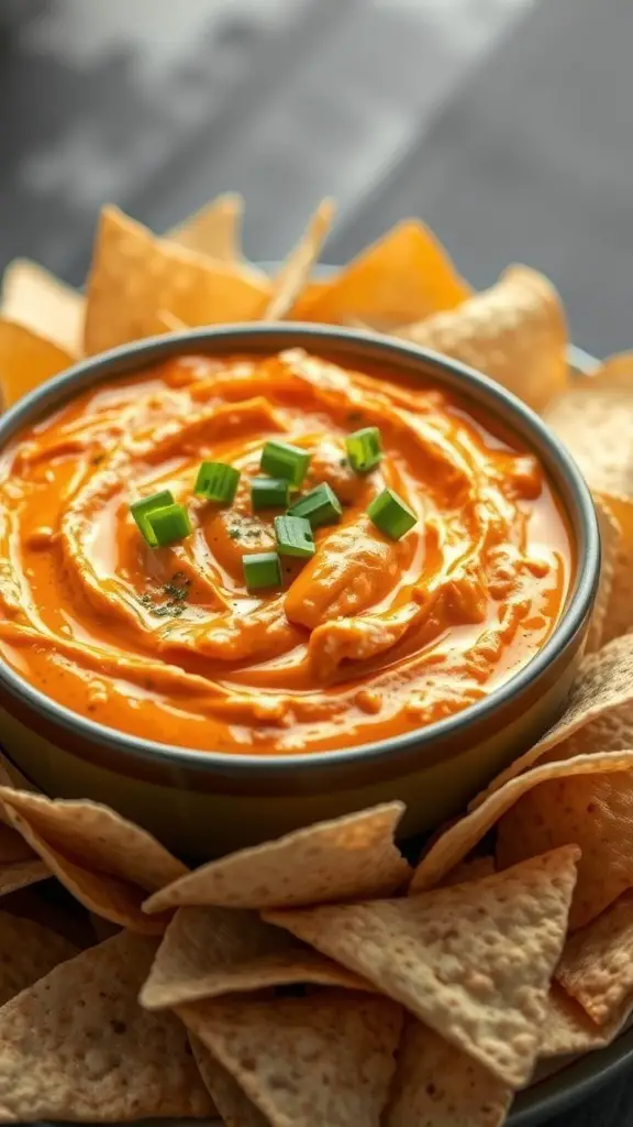 This Buffalo Chicken Dip is a crowd-pleaser, perfect for game days or casual gatherings. The vibrant orange color hints at the spicy flavor packed inside. Creamy and rich, it’s topped with fresh green onions for a pop of color and taste.