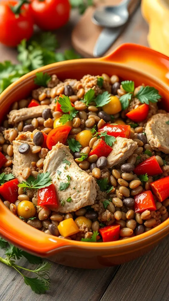 Chicken and Rice Pilaf is a comforting dish that brings together tender diced chicken breast and fluffy rice. The image shows a delicious bowl filled with perfectly cooked rice, chicken pieces, and vibrant cherry tomatoes. The bright green parsley adds a fresh touch, making it visually appealing.