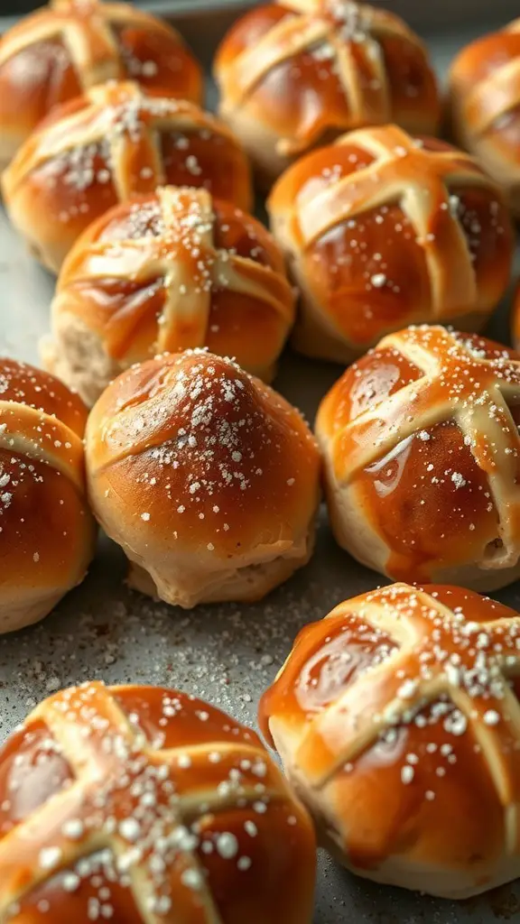 Hot cross buns are a classic treat, especially during Easter. These sweet, spiced buns are often marked with a cross, symbolizing the crucifixion. The image shows a delightful batch of freshly baked hot cross buns, golden brown and glistening with a spiced glaze. Each bun is topped with a sprinkle of sugar, adding a touch of sweetness.