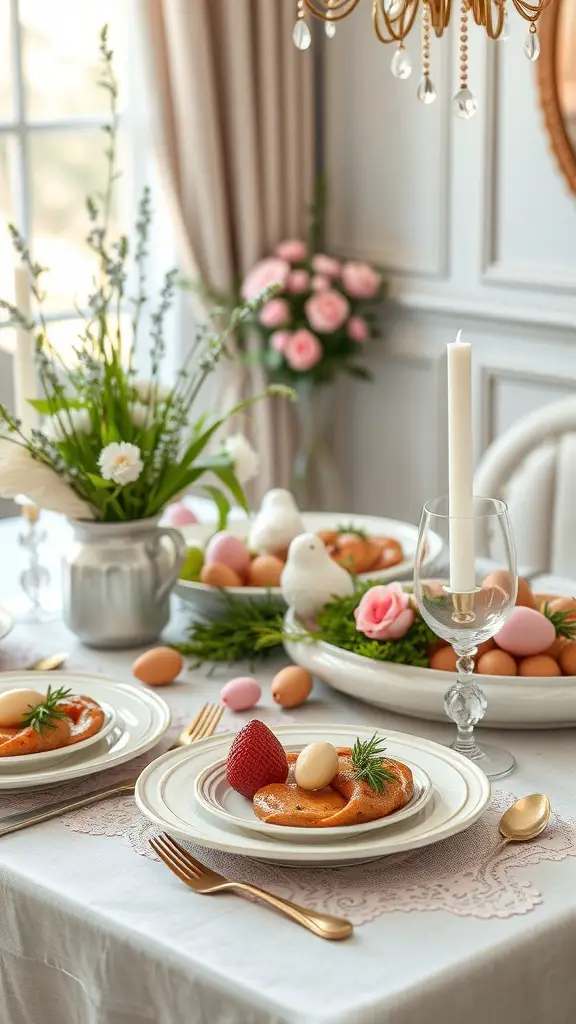Setting the table for Easter can be a delightful experience. Picture a beautifully arranged dining space, where soft colors and fresh flowers create a warm atmosphere. The image showcases a lovely table setting with delicate plates, fresh strawberries, and charming decorative eggs.