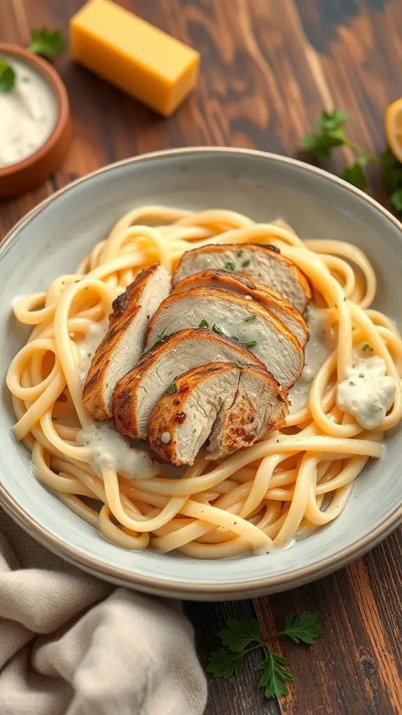 To make this dish, you’ll need rigatoni pasta, grilled chicken breast, heavy cream, garlic, Parmesan cheese, and some seasoning. Cook the pasta until al dente, then prepare the Alfredo sauce by simmering cream with garlic and cheese until smooth. Combine everything and top with grilled chicken for a satisfying meal.