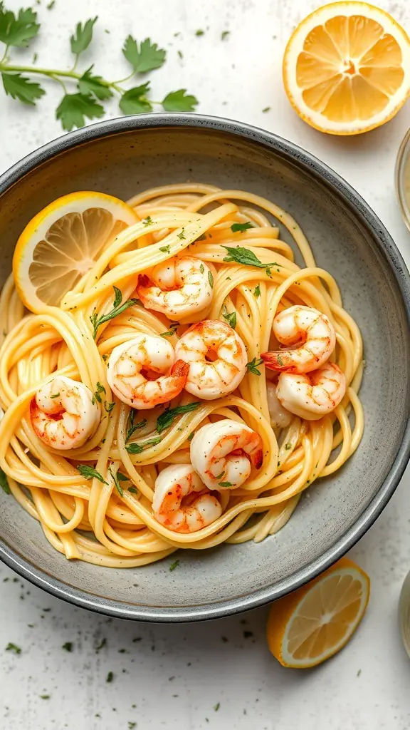 In the image, you can see the shrimp glistening with a hint of garlic and herbs. Fresh parsley adds a pop of color, making the dish visually appealing. Lemon wedges are placed on the side, ready to squeeze over the pasta for a zesty kick.