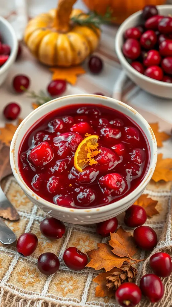 The image shows a bowl filled with vibrant red cranberries and orange chunks, glistening in a sweet syrup. The bright colors make it visually appealing, perfect for a festive table setting.