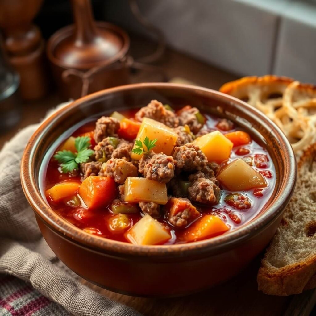 This hearty hamburger stew is a one-pot wonder that combines ground beef, tender vegetables, and a rich, savory broth. It’s quick to make, budget-friendly, and perfect for weeknights or cozy weekends. The beauty of this recipe is in its flexibility—you can use what you already have on hand and it still comes out tasting delicious. With its rustic charm and comforting flavors, it’s the kind of meal that feels like it’s been simmering all day, even though it only takes about an hour from start to finish. Make a big pot, and you’ll have leftovers that taste even better the next day.