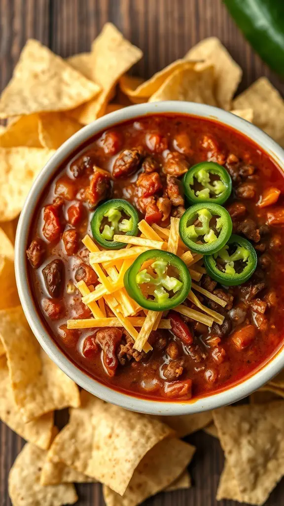 Chili con carne is a hearty dish that warms you up from the inside out. The image shows a bowl filled with a rich, spicy chili, topped with fresh jalapeño slices and shredded cheese. Surrounding the bowl are crispy tortilla chips, perfect for dipping.
