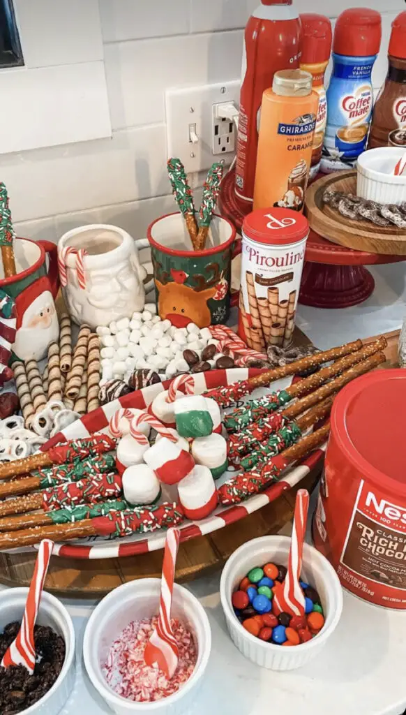 The bar features a generous container of rich hot cocoa mix, multiple flavored syrups and creamers, and an overwhelming array of colorful toppings. The centerpiece is a tray loaded with chocolate-dipped pretzel sticks and holiday-colored marshmallows, guaranteeing a fun, maximalist experience.