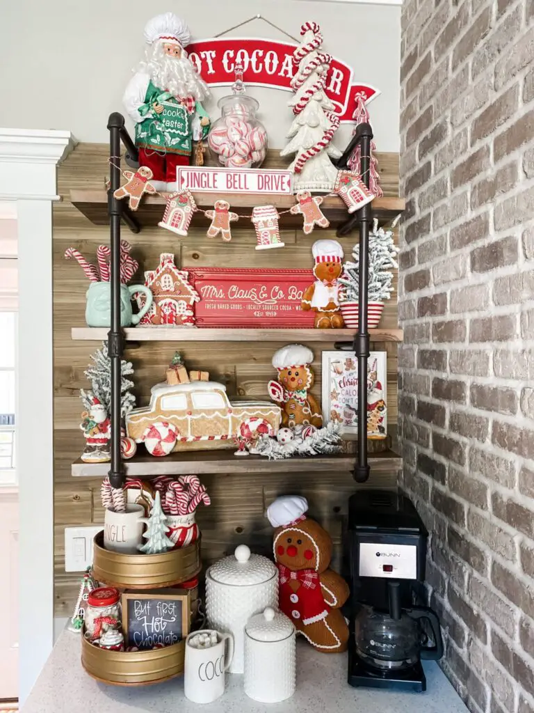 This multi-layered shelf unit is a celebration of all things gingerbread and cocoa, combining decor and function seamlessly against a rustic brick backdrop. The visual theme is strong and delightful.