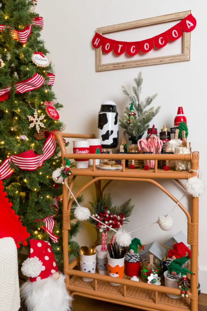 The two tiers hold everything you need: cocoa mixes, charming mugs (including a snowman mug and “Naughty” and “Nice” ones), mini candy canes, and even a gingerbread man cookie. It’s organized and utterly charming, proving you don’t need a lot of space for a great bar.