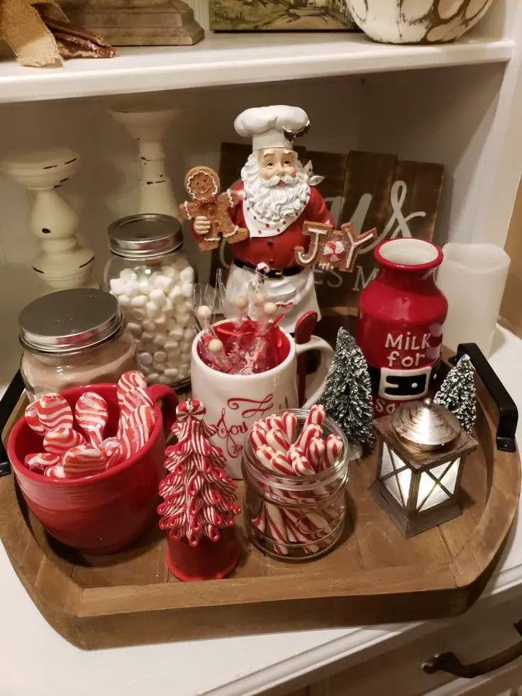 This presentation creates a mood that is welcoming, traditional, and perfectly ready for a cozy gathering, transforming a simple tray into a holiday vignette. A great tip is using clear glass jars for your cocoa mix and marshmallows; they allow the texture and color of the ingredients to become part of the decor.