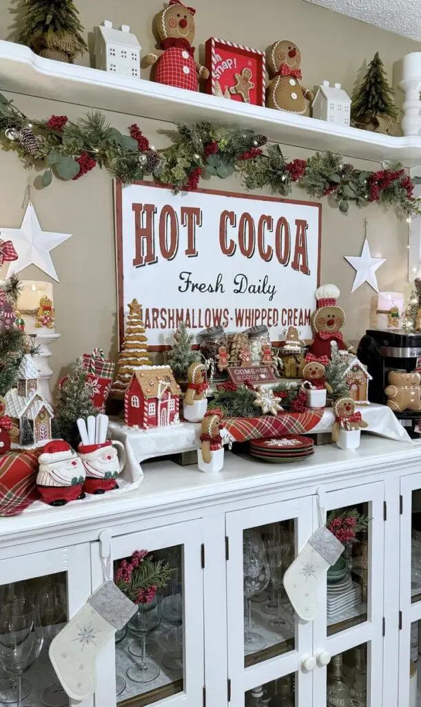 The shelves are filled with charming gingerbread men, tiny houses, a cute gingerbread car, and various signs proclaiming holiday cheer. On the counter, large white canisters neatly hold the essential cocoa and topping supplies, grounding the display.