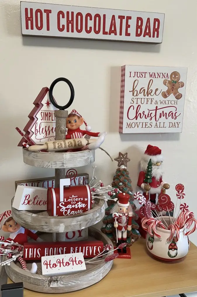 The tiers are adorned with red and white signs, elves, a nutcracker, and a whimsical miniature mailbox for letters to Santa. A simple mug of candy canes sits ready for a festive stir.