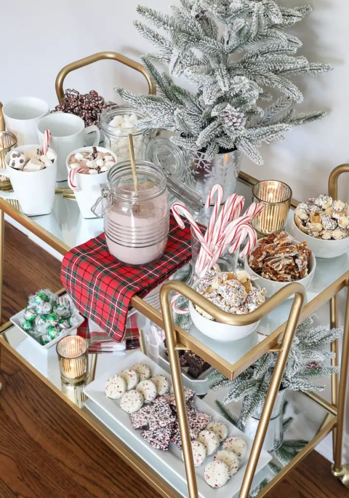 The cart holds a large jar of cocoa mix, bowls of crushed pretzels and popcorn mix, and a plate of festive white-chocolate dipped cookies, providing salty and sweet balance to the creamy drink. The flocked mini Christmas trees and twinkling candles add a delicate, wintry sparkle.