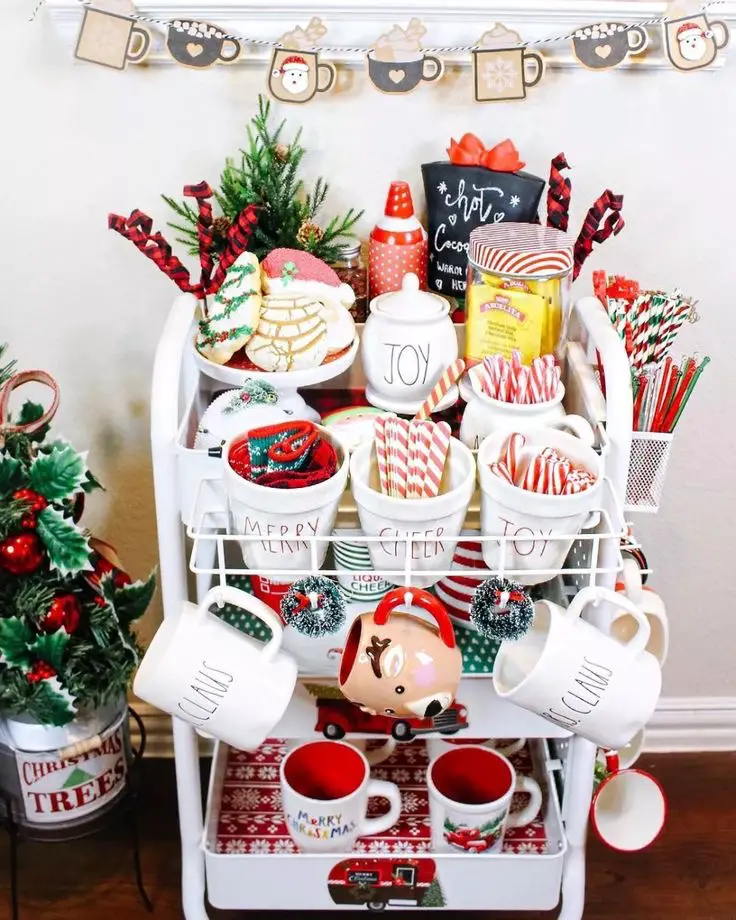 This bright, cheerful cocoa bar utilizes a white utility cart, maximizing vertical space for a dense, colorful display. Every item contributes to the holiday theme, from the mugs that spell out “MERRY” and “CHEER” to the tiny decorative wreaths hanging from the handles.