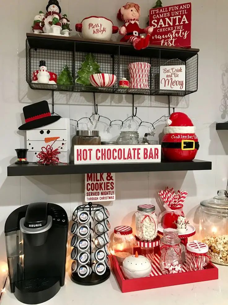 This cozy cocoa corner uses an existing kitchen or dining shelf unit, making it a permanent decorative fixture for the season. The dark metal shelving and warm wood surfaces create a rustic, welcoming backdrop for the red and white decor.