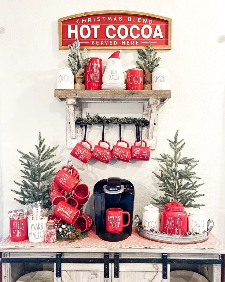 Focused around a Keurig machine, this vibrant Hot Cocoa Bar Christmas utilizes a tiered mug rack and several red and white canisters for a bold, impactful display. The overall look is clean, modern, and high-energy.