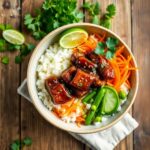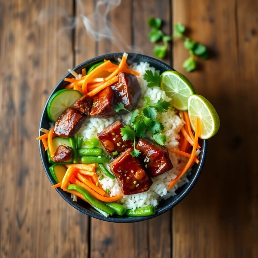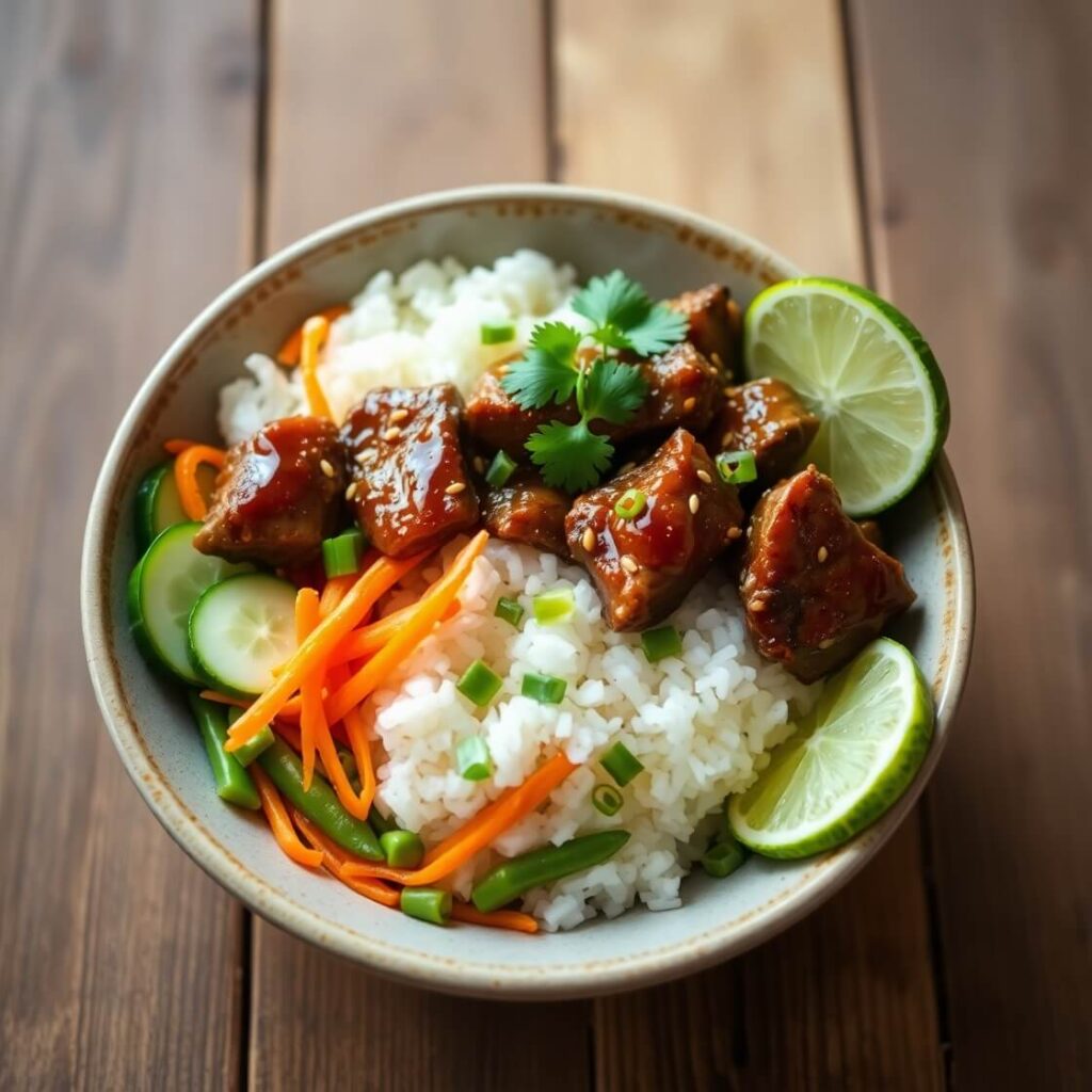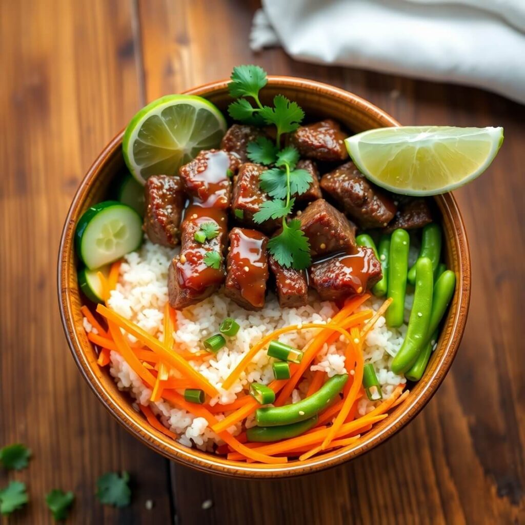 - Assemble bowls: Add rice, top with beef, arrange veggies, and garnish.