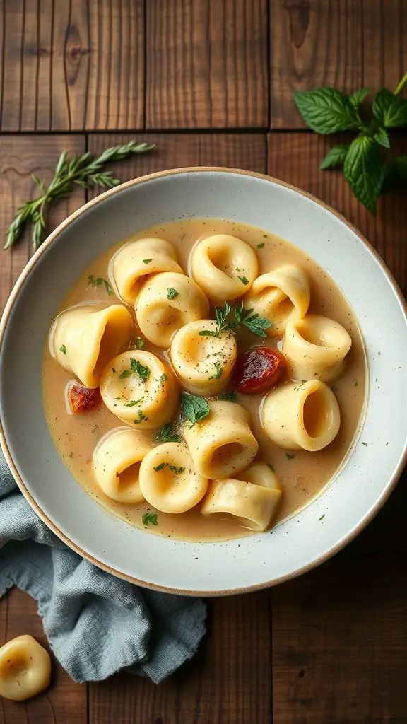 The image captures a beautiful bowl of tortellini in a clear broth, garnished with fresh herbs. The tortellini, with their charming shape, look inviting and delicious. The warm tones of the broth and the rustic wooden table create a cozy vibe, perfect for a festive dinner.