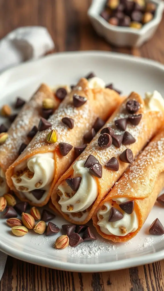 The image shows cannoli beautifully arranged on a plate, topped with chocolate chips and sprinkled with powdered sugar. The addition of pistachios adds a pop of color and flavor. Each bite is a perfect blend of textures and tastes.