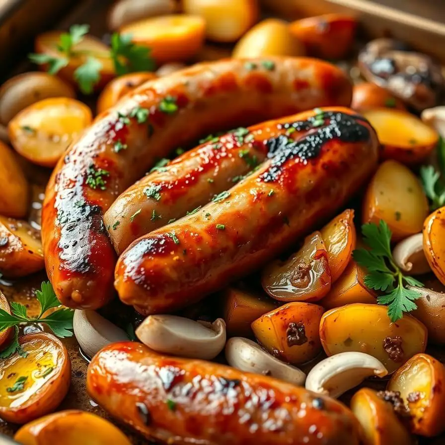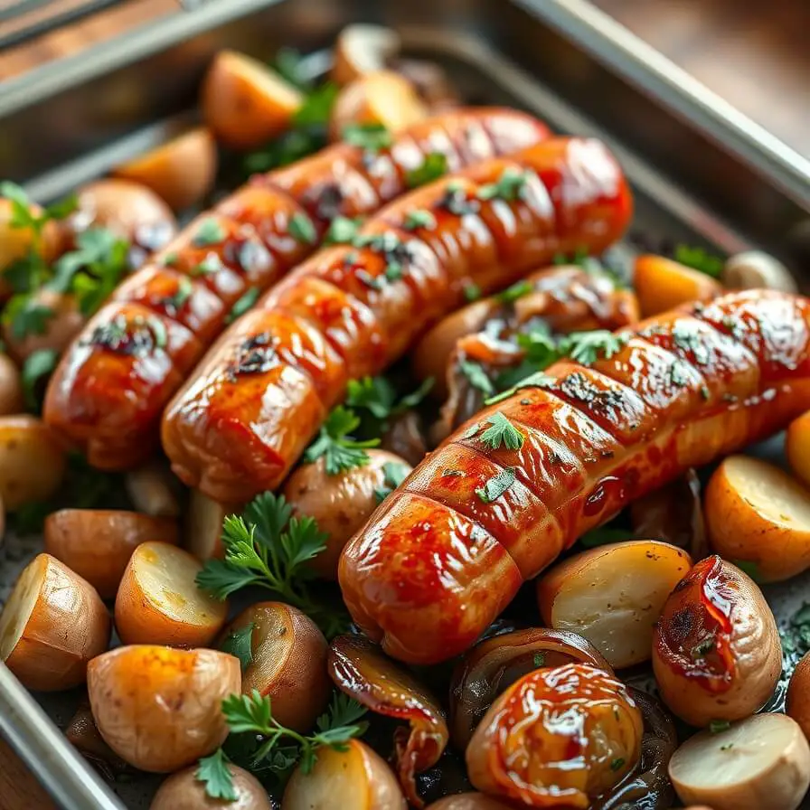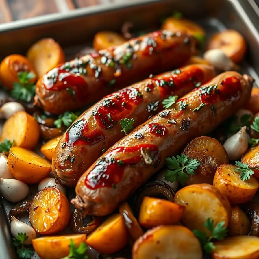 - Roast for 40–45 minutes, flipping halfway through, until potatoes are golden and sausages are browned.