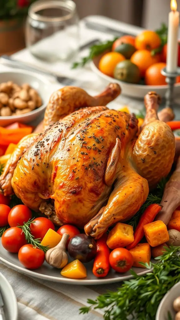 To make this dish, start with a whole chicken. Season it with herbs like rosemary and thyme, and add garlic for extra flavor. Roast it in the oven until the skin is golden brown and crispy. Pair it with seasonal vegetables like carrots, bell peppers, and cherry tomatoes. These veggies not only add color but also enhance the taste of the chicken.