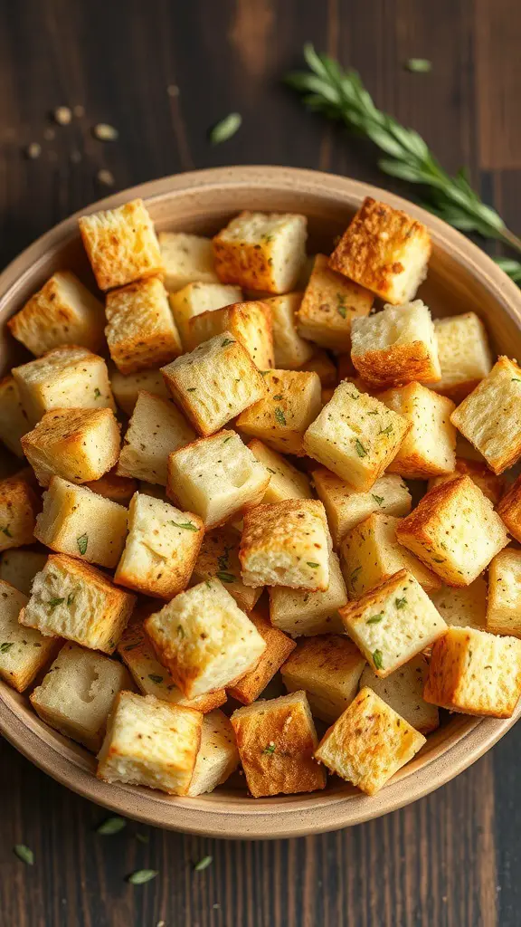 Croutons are a fantastic way to use leftover bread. They add a delightful crunch to salads, making every bite more enjoyable. The image shows a bowl filled with golden, crispy croutons, perfectly seasoned and ready to elevate your dish.
